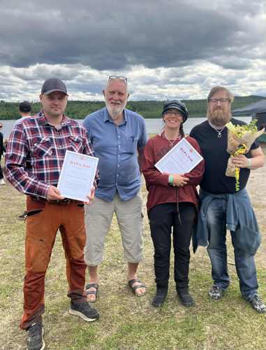 Från Vänster: Kulturstipendiat 2025 - Jörgen Stenberg, Allmänna utskottets ordförande Lennart Gustavsson (V), Årets Landsbyggare 2025 - Käbi och Adrian Bergsten.
